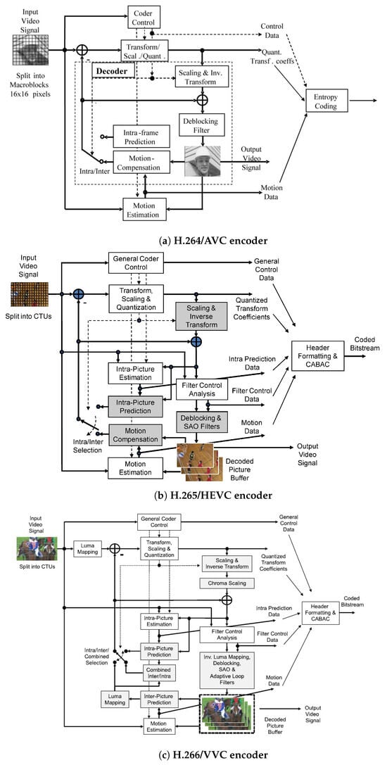 The biggest advantage of the VVC codec, as its name implies, is its versatility, which means the efficient encoding of a wide range of video content and applications. Although it is not widely used at present, it holds great promise for the future [2] AOMedia Video 1 (AV1) is an open, royalty-free video codec that was developed in 2015 by the Alliance for Open Media (AOMedia) to succeed Google’s VP9 codec. AOMedia is a huge consortium that includes many companies, providers, video content producers, software development firms, and web browser vendors [3,4]. High-efficiency video coding (HEVC), also known as H.265 or MPEG-H Part 2, is a video compression standard that was developed in 2013 to overcome H.264/AVC codec. HEVC is a video project of the ITU-T Video Coding Experts Group (VCEG) and the ISO/IEC Moving Picture Experts Group (MPEG) standardization organizations, working together in a partnership known as the Joint Collaborative Team on Video Coding (JCT-VC) [4,5]. Advanced video coding (AVC), also known as H.264 or MPEG-4 Part 10, is a video compression standard of the same standardization organizations as the HEVC codec. Although it was developed in 2003, it remains one of the most popular codecs for the recording, compression, and distribution of video content [6].