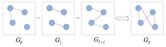 Given a sequence of network snapshots of length T as , denote a snapshot of the network at moment t, defined as , where denotes the set of nodes and M is the total number of nodes, and denotes the set of links. Opportunistic network link prediction aims to predict based on a sequence of network snapshots of length T, as shown in Figure 1.