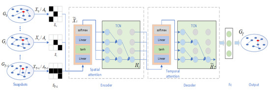 In this paper, we propose a link prediction model STA-TCN based on temporal convolutional network and attention mechanism, as shown in Figure 3. The architecture of STA-TCN is composed of two components: a spatial attention-based encoder and a temporal attention-based decoder. The encoder extracts the spatial features [23] to obtain the matrix sequence , and inputs the sequence into the TCN [24] for further encoding to obtain the spatial-temporal features ; the decoder introduces the temporal attention to process the encoded features to obtain , and inputs the processed features into the TCN for further decoding to get the node representation , and go through the fully connected layer to get the predict network for the next moment .