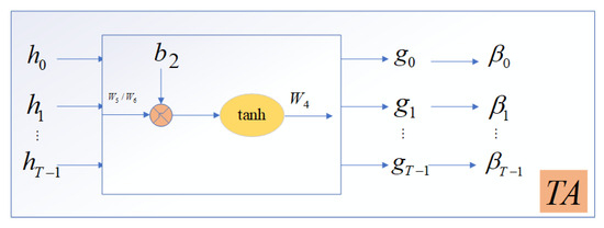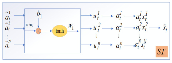 where , and are the learnable parameter matrices, denotes the i-th row vector of , is the bias vector, and denotes the attention value of the i-th node at the network snapshot t. The attention weight of the normalized node at moment t is shown as follows: