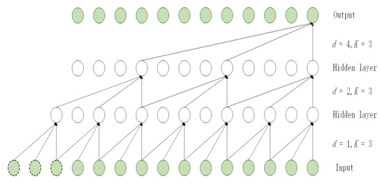 The series weighted by spatial attention is input into the time-series model TCN, which is a hierarchical model composed of multiple layers of dilated causal convolutions for extracting relationships. Figure 5 illustrates the architecture of a TCN with 3 layers of dilated causal convolutions, where the output of the final layer captures the temporal dynamics in the history. Using a TCN with L layers to establish the temporal model of the node , where L represents the number of convolutional layers, each layer includes dilated convolutions, activate functions and normalization operations. Node at time t uses dilated causal convolutions for computation as shown as: