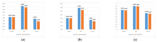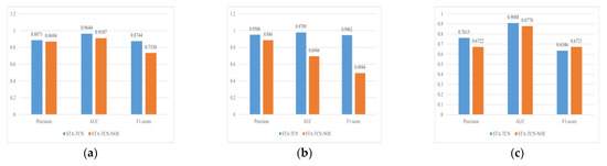 In the loss function construction, the auto-correlation error is adjusted to a non-correlation error, considering that the internal and external environments will generate an auto-correlation error on the prediction method, and this auto-correlation error will have an impact on the prediction results. In order to verify the effectiveness of the method of adjusting the auto-correlation error, the following experiments are designed to compare the STA-TCN method with the STA-TCN-NOE method without adjusting the auto-correlation error. In the ITC, MIT, and Infocom06 datasets, the opportunistic network slice size is set to 240 s, and other conditions are the same, and the experimental results are shown in Figure 10: