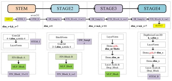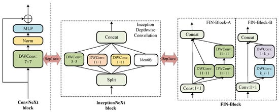 Block illustration of ConvNeXt [20], InceptionNeXt [21], FIN-Block-A, and FIN-Block-B. ConvNeXt uses a large convolution kernel 7 × 7 instead of the original 3 × 3, uses the depth convolution layer to move up to replace the original convolution layer, and combines Norm and MLP [32,49,50] to form the ConvNeXt block. Compared to ConvNeXt, InceptionNeXt is efficient in that it decomposes the expensive large kernel depth convolution into four efficient parallel branches. FIN-Block-A and FIN-Block-B refer to the Inception structure, using 1 × 1 convolution and stacked depth convolution instead of large kernel depth convolution. The variable convolution kernel size allows for a more reasonable model structure.
