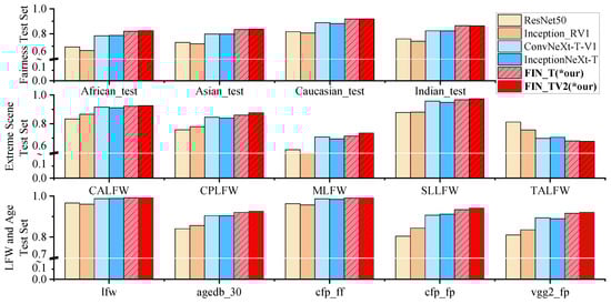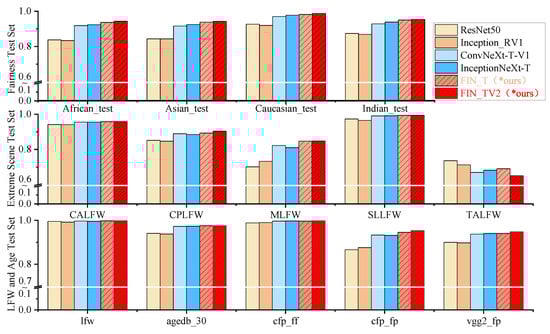 The results of training on the MS-wo-RFW dataset are shown in Figure 4 and Figure 6. The accuracy Acc-mean(TAR@FAR0.001) obtained by the ResNet and Inception-ResNet models are 0.9040, 0.8878, 0.9059, and 0.8933, respectively. Training on the CASIA-WebFace dataset, we found that the use of a deep model resulted in performance degradation. The result of training with ConvNeXt is that the performance degradation of the model is suppressed but not completely eliminated. The results of the InceptionNeXt model improved compared to ConvNeXt, but the results were unstable. We propose that the model achieved an improvement in accuracy when the stage was (3,3,9,3) and (5,5,10,5). And, under the deeper small and base models, the accuracy of our model improved, which solved the problem of model performance degradation. In comparison, under the same parameters of our model, the accuracy of the FIN-T model is 0.9533, which is higher than the 0.9477 and 0.9494 of ConvNeXt-Tiny and InceptionNeXt-Tiny. The highest performance of FIN-SV2 is 0.9599, which is the best result in our experiments. Furthermore, the performance of our model on the TALFW (Transferable Adversarial Labeled Faces in the Wild) dataset leads to the same conclusion as on CASIA-WebFace.