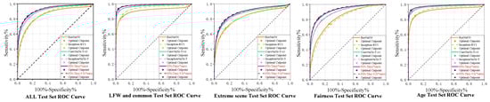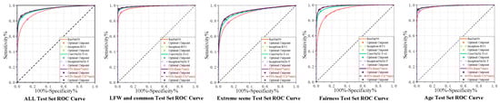 ROC performance on CASIA-WebFace for related models. We divided the benchmark into five aspects to plot the ROC curve and analyze the model’s performance on various specific tasks, i.e., ALL Test Set ROC Curve, LFW and common Test Set ROC Curve, Extreme scene Test Set ROC Curve, Fairness Test Set ROC Curve, and Age Test Set ROC Curve. Our model achieves optimal performance on all ROC curves, as seen in the locally zoomed images. In one of the ROC curves for the extreme scene, the negative effect of TALFW is masked by the inclusion of five datasets.