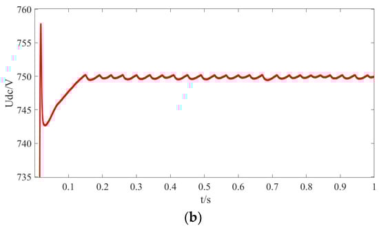 Through Figure 17, it can be found that the DC-side voltage is stable at about 750 V under the SMC control strategy, and there exists a voltage jitter of about 0.4 V up and down, which is the jitter of the intrinsic frequency that exists in the traditional sliding mode control.