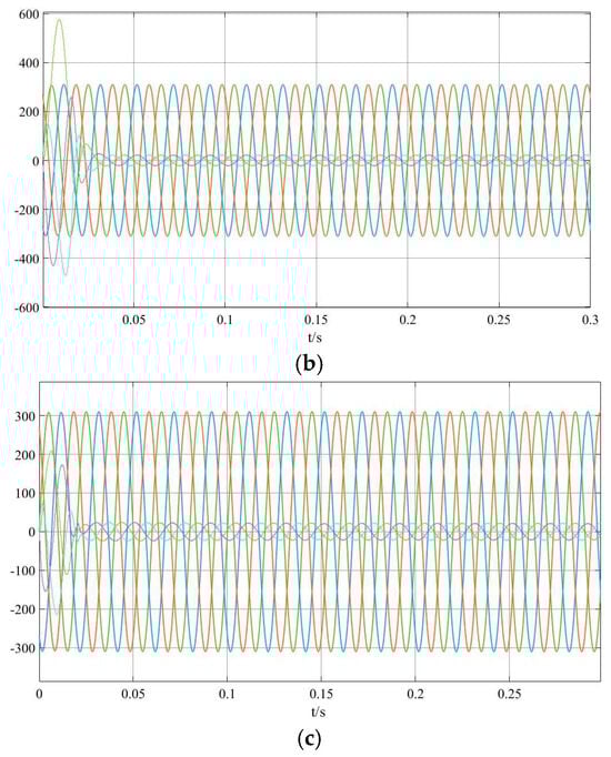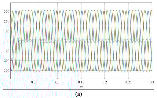 Figure 8 shows the three-phase voltage and current waveforms of the AC side under the three control strategies. It can be found that the time for the three-phase current to reach steady state under the PI control strategy is longer than that of the other two control methods, and it takes 0.1 s for the three-phase current to reach a steady state under the PI control strategy, while the other two control methods reach a steady state in 0.02 s after start up. It is also found that there are start-up inrush currents under all three control strategies, the start-up inrush current is the largest under the SMC control strategy, and the start-up inrush current is the smallest under the V-SMC control strategy, but it is still very large. The unit power factor characteristics are very good under all three control strategies.