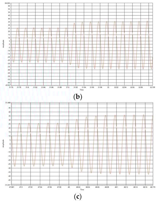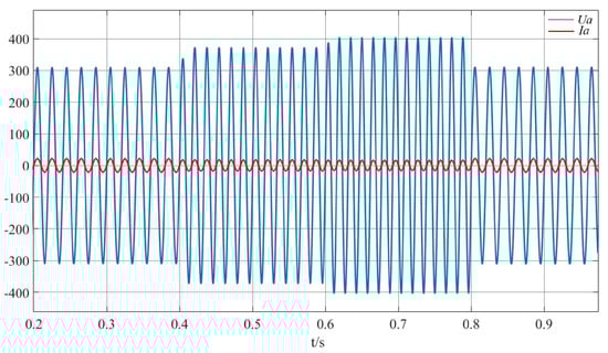 Figure 9 shows the waveforms of DC output voltage when the AC side of the system is wide input. A value of 0.4 s is found when the motor speed is changed from rated value to overspeed, the RMS value of the three-phase AC power is 264 V and the frequency is 60 Hz; a value of 0.6 s is found when it is still overspeed, the RMS value is 286 V and the frequency is 65 Hz; a value of 0.8 s is found when the motor is restored to the normal operation state, the RMS value is 220 V and the frequency is 50 Hz; a value of 1 s is found when the motor speed is below the rated speed, the RMS value is 176 V and the frequency is 40 Hz; a value of 1.2 s is found when the motor is restored to the normal operation state, the RMS value is 220 V and the frequency is 50 Hz. A value of 1 s is found when the motor speed is lower than the rated speed, the effective value is 176 V and the frequency is 40 Hz; a value of 1.2 s is found when the motor returns to the normal running state, the effective value is 220 V and the frequency is 50 Hz. Through the simulation results, it can be found that with the output voltage under the PI control strategy there is a voltage jitter of 2–5 V, and at the same time the regulation time is between 0.05 and 0.15 s, and the dynamic performance is poor; SMC has a voltage jitter of 1–3 V. A 1–3 V voltage jitter, while the response speed is about 0.05 s, compared with the traditional PI control strategy, is a big improvement, but there is the inherent jitter of SMC; the V-SMC control strategy proposed in this paper has almost no voltage jitter, and the response speed is very fast, and the voltage is restored to the desired value in about 0.015 s. Voltage overshoot, regulation time and power quality have better dynamic performance and robustness.