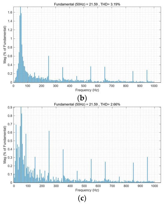 Harmonic content of AC side of the system under three control strategies. (a) PI control strategy. (b) SMC control strategy. (c) V-SMC control strategy.