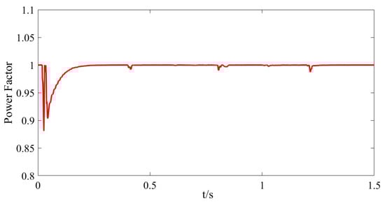 From Figure 12, it can intuitively be seen in the PWM rectifier steady-state operation that it is fully able to achieve normal operation under the unit power factor; in the case of AC-side voltage and frequency fluctuations, it is also able to quickly return to the unit power factor operation state, and there is almost no fluctuation; the power factor is maintained at above 0.99; the dynamic performance is very good.