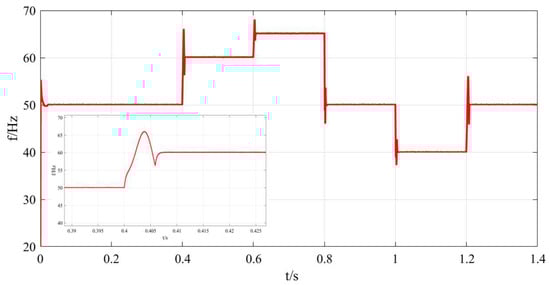 Figure 13 shows the waveforms corresponding to the frequency change of the control strategy proposed in this paper when the AC side of the rectifier has a wide input. As can be seen from the figure, the phase-locked loop can accurately perform phase locking, and can recover to the corresponding frequency value in a very short time when the voltage amplitude and frequency of the AC-side change abruptly, and the fluctuation is small, which has almost no effect on the rectifier.