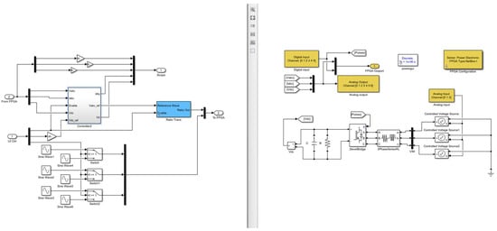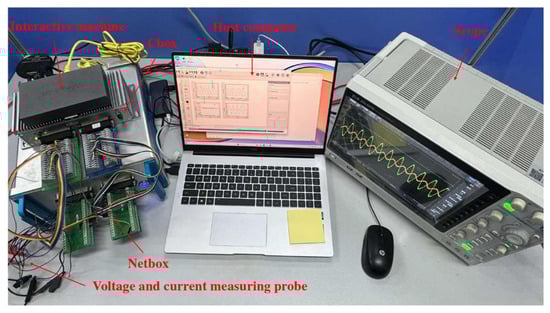 Figure 14 shows the semi-physical experimental platform used to verify the control strategy proposed in this paper. It consists of several parts: host computer, scope, Cbox, Netbox, interactive machine and voltage and current measuring probe. The analogue signals output from the corresponding ports of the Netbox board are measured via the voltage and current probes, and the analogue signals are transmitted to the CPU + FPGA module of the Cbox, which carries the control part, generates the digital signals through the arithmetic operation and transmits them into the Netbox, forming a closed-loop process, thus realizing the experimental verification. In the whole process, the interoperator allows the host computer, Cbox and Netbox to achieve real-time interconnection; in the host computer, the hardware part and the control part of the simulation model are divided and then loaded into the Netbox and the Cbox, respectively, through DeskSim 22.0.5.0; the oscilloscope monitors the waveforms of the required observation signals in real time. Figure 15 shows the model loaded via DeskSim software after differentiation.