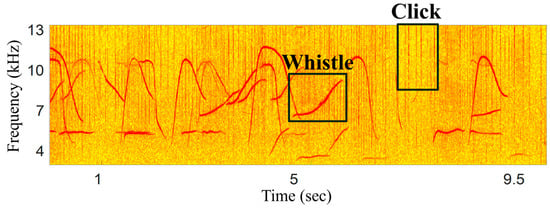 The dolphin sounds used in in the biomimetic UWA covert communication can be classified into clicks and whistles. Figure 1 depicts an example of a real dolphin’s call signal in which the click and whistle sounds are mixed. In Figure 1, the click sounds have a short period in time with a broad frequency band and the whistle sounds have a relatively longer time and various shapes in time frequency domain.