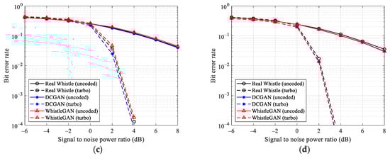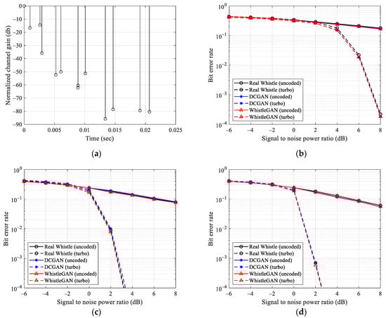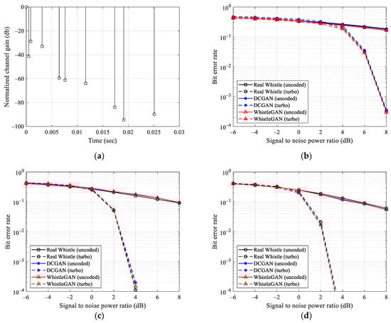 Figure 7a–d, Figure 8a–d and Figure 9a–d depict the CIRs, the BERs of the CV-CFM, BERs of the OFDM, and the BERs of the HOWM, respectively. The black line, the blue line, and the red line denote the BERs with the real whistles, with the whistles by the DCGAN, and with the proposed WhistleGAN. The solid lines denote the uncoded BER and the dashed lines denote the coded BER.