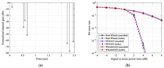 In this subsection, the BER of the biomimetic UWA communication using the real dolphin whistles and the generated whistles are compared. The DCGAN (256) and the proposed WhistleGAN were used to generate the whistles. DCGAN (128) was not used for the comparison because the DCGAN (128) has low DoM. The modulation methods used for the communication were CV-CFM, orthogonal frequency division multiplexing (OFDM), and hybrid orthogonal whistle modulation (HOWM). The data rates of the three techniques were set to 50 bps [16,17]. The modulation parameters of all methods were the same as in previous studies and a symbol bandwidth was 200 Hz and the forward error correction was a 1/3 turbo code [16,17]. The computer simulations were performed on three UWA channels attained from the West Sea, South Sea, and East Sea of Korea. The channel impulse responses (CIRs) and BER results of each UWA channel are shown in Figure 7, Figure 8 and Figure 9.