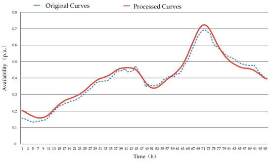 Anomalies and missing values are removed from the historical daily wind power output data, and the output data is normalized (output data/daily installed capacity). Subsequently, the data is filtered for noise reduction using the Extended Kalman Filter (EKF), followed by smoothing with the smooth function, and the daily peak-to-valley difference rate is calculated. The daily output curves with a peak-to-valley difference rate in the top 10% (about 150 curves) are extracted for further research. The comparison of the data before and after preprocessing is shown in Figure 2. The preprocessed curves are smoother and retain the characteristics of the curves.