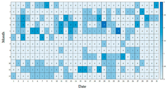 Statistical analysis of the processed wind power data on a monthly basis reveals that the days with the top 10% peak-to-valley differences in wind power output are distributed throughout the year, as shown in Figure 3. The occurrence probability is higher in spring, autumn, and winter, corresponding to January–May and September–December, while the frequency is lower in summer, corresponding to June–August. The seasonal distribution probability of days with large peak-to-valley differences is significant, but even during the low wind season in summer, there are days with large wind power daily output peak-to-valley differences. There is no apparent regularity in the distribution of various types of curves, so it is necessary in power system flexibility planning analysis to comprehensively consider various curve shapes and timings of the typical wind power output curves with large peak-to-valley differences. Furthermore, with the large-scale integration of wind power into the grid, the existing wind power data can represent the wind resources and wind power distribution in all regions of the studied provincial power grid. After standardizing the output data, it can provide a reliable research foundation for future power system flexibility planning analysis.