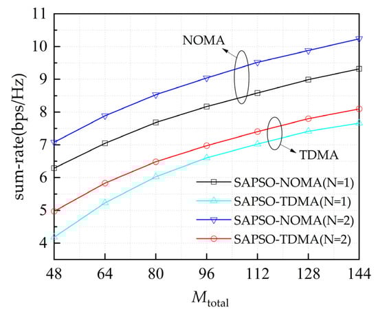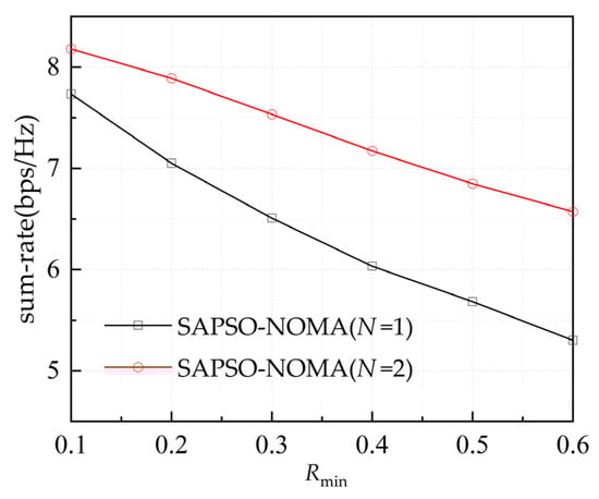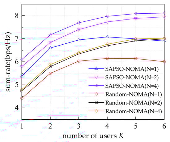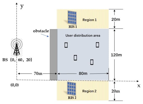 - Using the proposed multi-RIS deployment optimization algorithm, the sum-rate of the system can effectively be improved by about 1 bps/Hz. In addition, compared with a single-RIS scheme and a time-division multiple-access (TDMA) scheme, the proposed multi-RIS–NOMA scheme can significantly improve the sum-rate of the system.