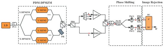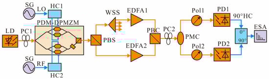 The schematic diagrams of the proposed scheme are shown in Figure 1. It mainly consists of a laser diode (LD), a PDM-DPMZM, a PC, a Pol, a wavelength selective switch (WSS), a polarization beam combiner (PBC), a polarization beam splitter (PBS), a 90° electrical hybrid coupler, an erbium-doped fiber amplifier (EDFA), and a photodetector (PD).