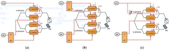RF input and DC biases of PDM-DPMZM under different phase-shift functions. (a) ±first-order LO harmonic mixing; (b) ±second and ±fourth-order LO harmonic mixing; (c) ±third-order LO harmonic mixing.