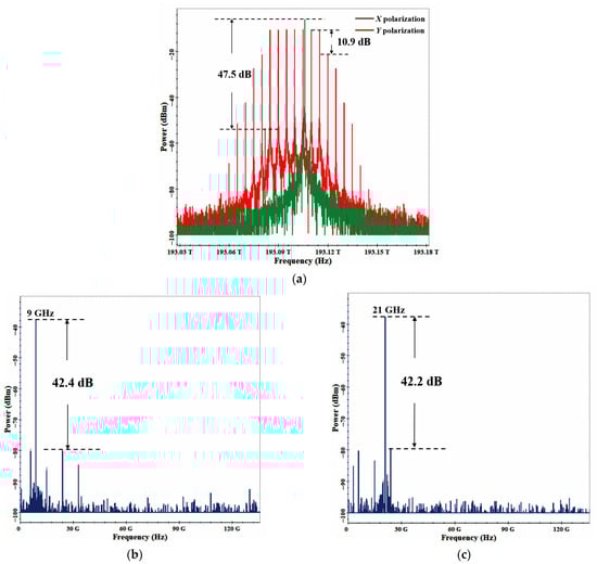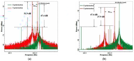 As shown in Figure 4a,b, the spectrum represented by the green line corresponds to the signal in the x-polarization direction, while the red line represents the signal in the y-polarization direction.
