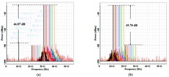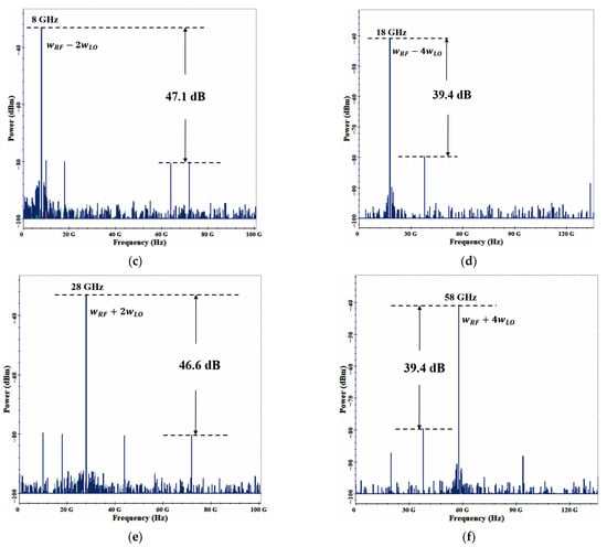 In order to verify the wide tunability of the second-order LO harmonic mixer, we tuned the RF/IF signal from 21 GHz to 30 GHz in steps of 1 GHz. For a fixed 5 GHz LO signal, an up-converted range of 31–40 GHz and a down-converted range of 11–20 GHz were realized, as shown in Figure 6a,b, respectively. It can be seen that the spurious mixing is suppressed by 46.87 dB and 49.78 dB, respectively, with high SSR. However, the SSR in [4] is only around 30 dB.
