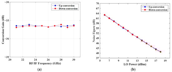 In order to verify the quality of the output signal of the second-order LO harmonic mixer, we analyzed the conversion gain and NF of the system. The power of the LO signal was set to 19.25 dBm. When the RF/IF frequency was tuned from 21 GHz to 30 GHz in 1 GHz steps, and the LO frequency was correspondingly tuned from 9 GHz to 13.5 GHz in 0.5 GHz steps, the IF frequency was fixed at 3 GHz in the down conversion. Alternatively, the LO frequency was tuned from 9.5 GHz to 5 GHz in steps of 0.5 GHz and the output RF signal frequency was fixed at 40 GHz at up conversion. The conversion gain for different RF/IF frequencies is shown in Figure 7a. It can be seen that the conversion gain is about −34 dB, with a fluctuation of about 0.4 dB. In order to measure the NF, the frequencies of RF/IF and LO were set to 18 GHz and 5 GHz, respectively. When the power tuning range of the LO signal is from 6 dBm to 18 dBm, the NF curve is shown in Figure 7b.