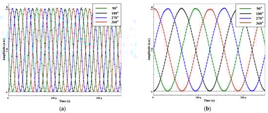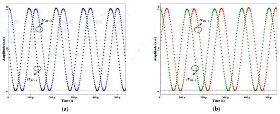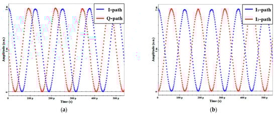 Taking the second-order LO harmonic down-conversion as an example, I/Q mixing and double-balanced mixing are achieved by appropriately setting the angles of and . Specifically, when , I/Q mixing is achieved, while when , double-balanced mixing is achieved. For simplicity, we assume , for I/Q mixing and , , for double-balanced mixing. The corresponding waveforms are shown in Figure 9a,b, respectively. It can be observed that in the case of I/Q mixing, the two waveforms have the same amplitude and phase difference, whereas in the case of double-balanced mixing, the waveforms have the same amplitude but an opposite phase.