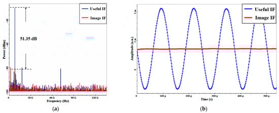In the simulation, the RF signal and image signal are applied simultaneously, and the electrical spectrum and waveform of the down-converted signal are shown in Figure 11a,b, respectively. It can be observed that the IF signal generated by the image signal frequency conversion is well suppressed with an IRR of 51.35 dB as presented in Figure 11a. In the same situation without using a 90° optical hybrid coupler, the IRR is also better than the 45.91 dB in [10]. Additionally, in Figure 11b, the amplitude of the IF signal waveform generated by the frequency conversion of the image signal is almost zero. The above analysis is well supported by the simulation results.