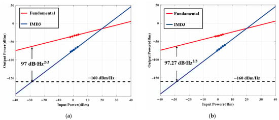 Finally, the dynamic range of the proposed system is evaluated by measuring its SFDR. The frequency of the LO signal is set to 5 GHz. A two-tone signal with frequencies of 18 GHz and 18.1 GHz is employed as the RF signal. The power of the two-tone RF signal is gradually increased from −2 to 6 dBm, and the power of the fundamental term and the third-order intermodulation distortions (IMD3) are recorded. The results are presented in Figure 12. Assuming that the noise floor is −160 dBm/Hz, the SFDR of the up-conversion and down-conversion are 97 dB·Hz2/3 and 97.27 dB·Hz2/3, respectively.