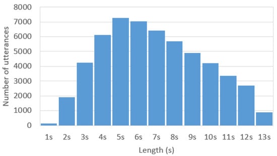 Figure 2 shows the voice distribution by gender in the LSVSC. The number of sentences utterred by female and by male speakers are approximately equal. Figure 3 describes the voice distribution by regional dialects in the LSVSC. The majority of the data in the corpus are spoken by the Northern dialect speakers because the Northern dialect is the standard dialect in Vietnam and very popular in the media. Central and Southern dialects account for 7.65% and 3.54%, respectively. The Central highland dialect represents 0.66%, and the minority ethnic group dialect is only 0.05%. The voice distribution by the length of utterances is illustrated in Figure 4. In this corpus, most utterances have the length from 3 s to 10 s. The longest utterances have a length of 13 s, whereas the length of the shortest ones is about 1 s.