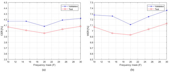 We select the best parameters of time masks, i.e., , and keep those parameters unchanged. We change the parameter of frequency mask (F) from 10 to 30 with a step of 5 to find out the value of F corresponding to the best performance of the sTransformer + adaptSA model. Figure 5 illustrates CERs and WERs of the sTransformer + adaptSA model with different values of frequency masks. It can be seen that with F = 20, this model obtains the best CERs and WERs for both validation and test sets.