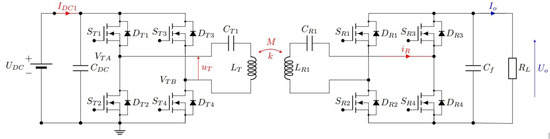 In the case of the IPT system presented in Figure 1, the basic series–series is used, or SS compensation. The main advantage of an SS compensation system is a fixed operating frequency, independent of the mutual inductance between the transmitter and the receiver coil [14]. Additional benefits include the design simplicity and symmetry that can be used in bidirectional wireless power transfer. The resonant frequency of the system is calculated using the following equation: