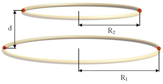 Figure 3 presents the single transmitter and single receiver loop with a distance d between them. The diameter of the transmitter loop is marked with R1, and the diameter of the receiver loop is marked with R2. When calculating the mutual inductance, the radius of the wire is not important.