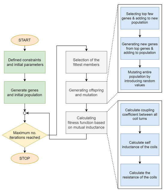 An evolutionary algorithm called the genetic algorithm was used to optimize the mutual inductance between the transmitter and the receiver coil [20,21]. The algorithm was inspired by the process of natural selection. The operation of the algorithm can be summarized in a few key steps: