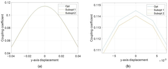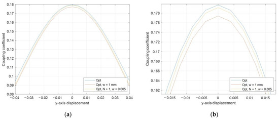 The results of the optimization for circular planar spiral coils with the same diameters: (a) y-axis displacement from −0.04 m to 0.04 m; (b) zoomed-in view from −0.015 m to 0.015 m.
