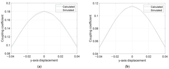 To confirm that the algorithm and the coupling coefficient, calculated using the proposed equation, provided the correct results, both optimization problems were tested using the simulation software Ansys Maxwell. The results are presented in Figure 7. The calculated results are presented with the blue line and the simulated results are presented with the orange line. Figure 7a presents the results in the case when both coils have the same diameter, and Figure 7b presents the results in the case when the receiver coil has a smaller diameter than the transmitter coil. From the results, it can be seen that the simulation results are nearly identical to the calculated results. There is some difference; however, it is not significant, and the simulation can be used to confirm that the equations correctly describe the coils.