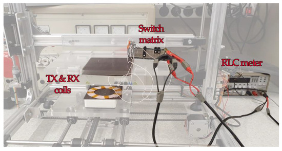 The mutual inductance and the coupling coefficient between the transmitter and the receiver coil were measured using the RLC meter. In order to position the transmitter and the receiver coil correctly, the coils were mounted onto the computer-controlled positioning system presented in Figure 8. The transmitter coil was mounted on the bottom platform, which could be moved in the horizontal x and y directions. The receiver coil was mounted on the top platform, which could be moved in the vertical z direction. In the current configuration, the system does not allow for the measurement of rotational tolerance.