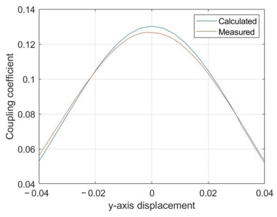 Figure 9 presents the results of a comparison between the fabricated coil and calculated results based on the equations presented in Section 3. The blue line represents the calculated coupling coefficient, and the red line represents the measured coupling coefficient. When the coils are perfectly aligned, the calculated coupling coefficient is larger than the measured value. However, at higher misalignments, the coupling coefficients are virtually the same. The main difference in the results is due to the simplification of the coil equations and defects in the coil manufacturing process. In the case of this paper, the coils were made by hand. However, despite the difference, the proposed algorithm can still help in the design process of wireless power transfer. Using the coil’s maximum dimensions, the optimal coil with the optimal number of turns and pitch degree can be evolved.