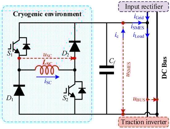In particular, the SMES compensation system is connected to the DC bus, which utilizes the rapid response of SMES to maintain the stability of the bus voltage and achieve a smooth transition between the maglev and the traction power system under acceleration and braking operating conditions. Specifically, when distributed renewable energy systems have power fluctuations or the traction system has short-circuit faults, the DC bus voltage will have a transient drop, and the SMES can rapidly discharge electric energy to stabilize the DC bus voltage and keep on providing the maglev with high-quality power. Meanwhile, when the maglev is accelerating or decelerating, and the DC bus voltage has a sudden increase or decrease due to the sudden load change, the SMES can quickly compensate energy or absorbing energy to achieve smooth power transitions, which can further improve the power supply quality and stability of the traction system. Compared to super-capacitors, SMES has the unique advantages of virtually zero loss, ultra-high power density, and ultra-fast response. However, for high-voltage applications, super-capacitors with series and parallel connections have problems of huge volume, high complexity, and non-uniform current/voltage management [,].