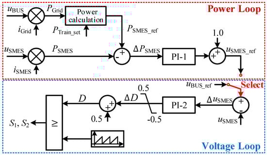 The control strategy for the SMES compensation system is shown in Figure 3. It adopts a two-level control strategy consisting of a power loop and voltage loop according to the operating status of the maglev train. When the maglev train is at constant speed, the voltage loop control is employed. Firstly, the voltage deviation (ΔuSMES) is obtained by subtracting the actual voltage from the rated reference voltage of the DC bus, and then, the PI operation is performed to obtain the duty cycle deviation (ΔD). The output duty cycle (D) is obtained by adding a base duty cycle of 0.5. Finally, modulation is performed with a triangular carrier wave with a switching frequency of 20 kHz to obtain the drive signals for the power electronic switches S1 and S2. Voltage single-loop control is adopted to achieve faster response compensation under DC bus voltage transient disturbances (e.g., sag/swell).