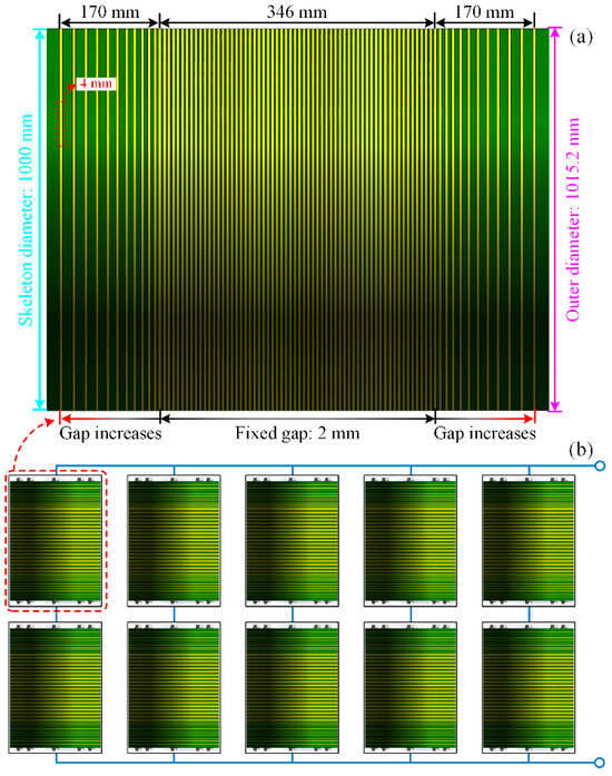 Based on Equations (9)–(12), taking into account a 10% converter operating loss and a 20% superconducting magnet energy storage margin, the SMES was designed to have 1.028 H/4.5 kA/10 MJ, with the initial operating current set at 3.8 kA. In particular, based on our existing design approach [], a varying-axial-gap-structured solenoidal superconducting magnet (2.57 H/900 A/1.04 MJ) was designed []. As shown in Figure 4a, each superconducting magnet unit consists of 80 single pancake coils with 19 turns, coaxially mounted with a basic gap of 2 mm between the single pancake coils. Furthermore, the axial gaps of 11 single pancake coils at the ends of the superconducting magnet were optimized and adjusted. Along the direction of the magnet ends, the axial gaps of the single pancake coils increased sequentially by 1.89 mm. Compared to the superconducting magnet with fixed gaps, using the same length of superconducting tape (4813.42 m), the critical current and storage energy of the optimized superconducting magnet increased by 20.46% and 38.67%, respectively. Finally, ten superconducting magnet units were connected in series and parallel to form the whole SMES, as shown in Figure 4b.