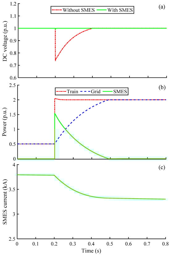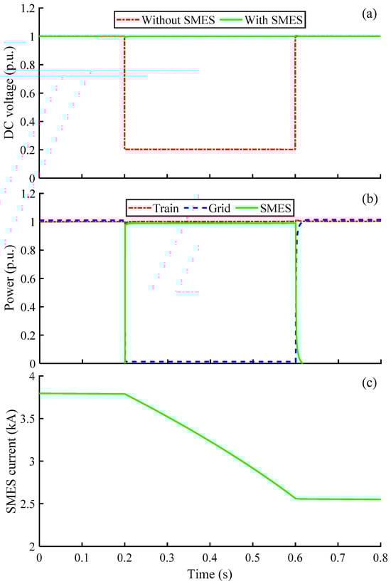 Case 1: At t = 0.2–0.6 s, the renewable energy generation had severe problems or the traction system had short-circuit faults, and there was a deep voltage drop (80%) in the DC bus, which was achieved by adding huge resistance to the DC bus in the simulation. This case tested whether the SMES system was able to compensate the transient voltage disturbance and improve power supply quality for the maglev.