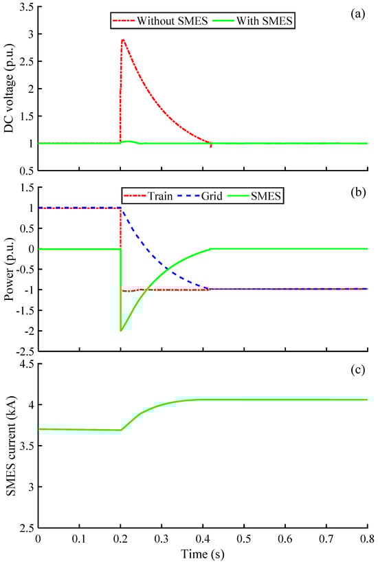 The proposed SMES system was able to effectively absorb a large amount of excess energy during the braking of the maglev with high speed, and also stably keep the DC bus voltage. As shown in Figure 7, during 0.2 s braking, the SMES system was able to absorb all the power (1.0 p.u.) re-generated by the linear traction motor, alleviating the voltage impact on the DC bus voltage caused by the braking of the maglev. After 0.42 s, according to the control strategy, the SMES’s absorbed power gradually dropped to zero, and the traction network’s absorbed power steadily increased to the maglev train’s regenerative braking power. Compared to the uncompensated condition, the SMES system reduced the temporary voltage of the DC bus from 2.9 p.u. to 1.04 p.u., which was within the allowable range of voltage fluctuation (10%). During 220 ms of the regenerative braking transition, the SMES absorbed 1.05 MJ of electrical energy from the maglev, and the operating current increased from 3.8 kA to 4.06 kA. This case study validated the effectiveness of the proposed SMES system and its control strategy, achieving stable supply voltage and smooth power transition.