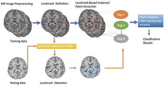 Our method’s schematic diagram is displayed in Figure 1. Anatomical landmarks were identified from MR images using a data-driven approach [14]. Subsequently, patches were retrieved using a patch-level data expansion technique depending on the recognized landmarks. The proposed multi-instance CNN-Transformer framework was used for brain MRI classification.