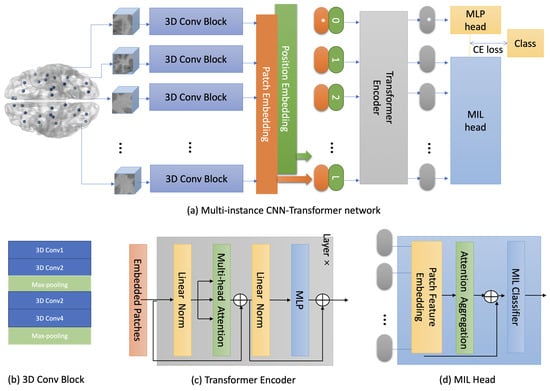 The multi-instance Conv-Transformer network was proposed for brain MRI classification as shown in Figure 2a. The input data are L patches taken from L landmarks given a subject. We first ran numerous sub-Conv architectures to reduce the complexity of 3D computations while learning representations of specific patches in each group. The network receives an input MR picture as well as a bag containing L patches, or instances, that were taken at L landmark points. More precisely, we used a sequence of convolution layers with stride size of 1 and 0-padding to embed L parallel sub-Conv architectures.