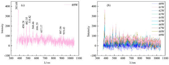 Spectral analysis is a widely used tool for plasma diagnostics and process monitoring during plasma material processing and is significantly important for ensuring processing precision, improving product yield, and controlling processing costs [12,13]. In atmospheric pressure plasma [14], the spectral lines of air and argon plasma emission were recorded and analyzed, and plasma parameters such as discharge current, discharge gap, and electron temperature were measured, which are used to control the process of materials’ surface modification promptly. The intensity of plasma emissive spectra could be enhanced by an argon additive; thus, the electron concentration as well as the energy was increased, which finally prompted the ionization rate to produce active N, O, and O3. In the work of Chen et al. [15], the relationships between processing parameters and plasma temperature during the laser additive manufacturing process were studied using the spectral diagnosis method. By constructing the corresponding relevance of time and plasma temperatures, the defect diagnosis of the whole cladding process was realized with relative accuracy. Jeong and Kim [16] investigated the behavior of nitrogen-active species during the pulsed dc plasma nitriding process, and emission spectra measurements were performed for various treatment temperatures and different gas pressures in the reactor. In the study [17], the spectral intensities were influenced by process parameters, which play a very important role in textile material surface modifications. Some researchers use collision radiation models to conduct quantitative analysis of plasma emission spectra [18], but the model relies on spectral diagnosis is affected by the deviation contained in basic physical data such as collision cross section, resulting in errors in the diagnostic results [19,20,21,22].