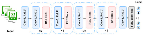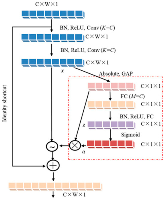 Figure 4 is a residual shrinkage block with channel thresholds, in which is the number of convolutional kernels in the convolutional layer, is the number of neurons in the FC layer, and , , and 1 in are the indicators of the number of channels, width, and height of the feature map, respectively. , , and are the indicators of the feature maps to be used when determining thresholds. The first two convolution layers, two batch normalization, and two activation functions transform the characteristics of redundant information into values close to zero, but transform useful features into values far from zero, which is then propagated into the two layers of the FC layer with multiple neurons (the number of neurons equals the number of channels in the input feature map). The output value of the th channel of the FC layer is scaled to a range of (0, 1) by Equation (3), which automatically learns a set of thresholds. Redundant features are eliminated and useful features are retained using soft thresholding.