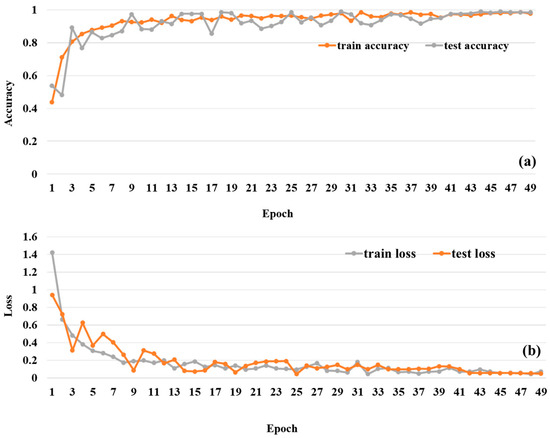 Figure 5 shows the curve of accuracy and loss changing as epochs during the model training and testing. It can be seen that both the accuracy curves of training and testing rise rapidly when the epoch is within 1–9. When the epoch is in the range of 9–41, both the accuracy curves of training and testing show the fluctuation, especially for the testing curve with a fluctuation between 91.5% and 98.3%. When the epoch is greater than 41, both the training accuracy and test accuracy gradually stabilize at above 98%. Figure 5b shows the loss curves of training and testing changing as epochs. One can see that both the loss curves of training and testing decline rapidly to below 0.2 when the epoch is in the range of 1–9. When the epoch is in the range of 9–44, both the loss curves of training and testing show the fluctuations. When the epoch is greater than 44, both the loss value of training and testing is only about 5%, indicating that the model has reached stability. During training of the model, the convergence speed of networks refers to the time required for the network to reach the optimal solution during training. In this experiment, the convergence rate of our model is 157 min, corresponding to 44 epochs.