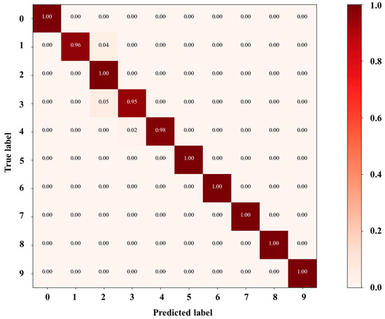 A confusion matrix, also known as error matrix, is a tool used to evaluate the performance of classification models, which can visually display the classification results of a model for different categories. It summarizes the data in matrix form based on two criteria: the actual class (i.e., the true label) and the class predicted by the recognition model (the predicted label). Figure 6 shows the confusion matrix of our model for the test set of 10 classes of ethylene plasma spectra, in which the horizontal axis represents the predicted labels, and the vertical axis represents the true labels. Color depth represents the prediction accuracy value, and the darker the color, the higher the accuracy. In the ten classes, the recognition accuracy for all classes is higher than 95%, as indicated by the deep red color on the diagonal, indicating the effectiveness of the proposed model for recognizing ethylene plasma spectra.